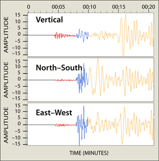 This animation shows both the movement of the three basic waves (P, S, and surface) and the effect of the waves on a building. The three seismograms produced by a modern seismograph station show that the P wave is more visible on the vertical component and the S wave amplitude is larger on the horizontal components.