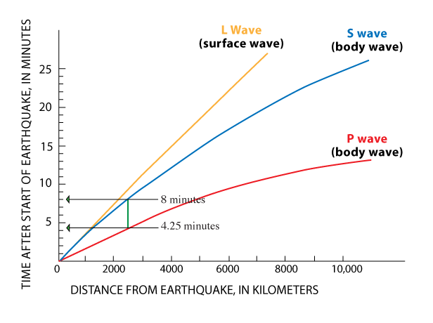 This classic classroom earthquake activity determines the distance to an earthquake from a seismic station by taking advantage of the difference in travel time for P and S waves. We will use the simplest case for an earthquake less than 3,000 miles away. Figure 1 shows a seismogram with the P, S, and surface waves colored using the scheme from the animation above to make arrival times stand out. Figure 2 is a simple Time vs. Distance graph that shows the travel time on the Y axis, against distance from the earthquake on the X axis as measured on the Earth’s surface in miles. The P wave in figure 1 arrived at a station 4 minutes and 15 seconds after the earthquake occurred and the S wave arrived at the station 8 minutes after the earthquake occurred. How far away was the earthquake? Make a vertical line on graph between the two arrival times. It only fits one place.