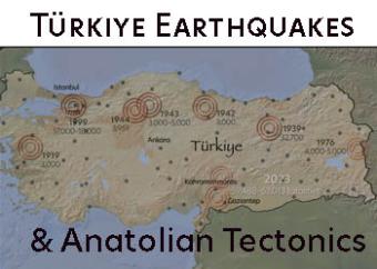 Many large earthquakes have occurred in Türkiye (Turkey), including the devastating 2023 earthquake doublet. The region surrounding Turkiye is broken into microplates, including the Anatolian Plate that contains most of the country of Türkiye. This animation examines the tectonic setting and history of the largest quakes.
