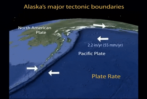 Alaskan tectonics are dominated by the Pacific-North American plates. The megathrust boundary between the plates results in both the 4,000-km-long Aleutian Trench and in the arc of active volcanoes that lie subparallel to the trench. This animation discusses the range of tectonic activity from megathrust earthquakes to accretion of geologic terranes.