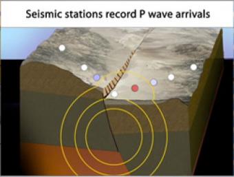 Cross section of the shallow crust in the Basin & Range. Earthquake produces seismic waves that bump an array of seismic stations. One station records the arrival of the seismic waves on a seismogram.