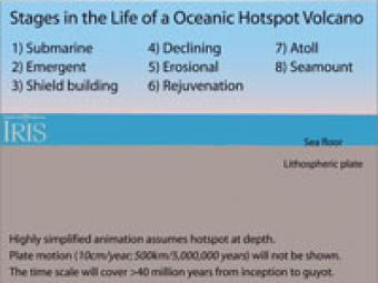 This animation shows the evolution of a single island in a hotspot chain as it forms and evolves over a period of about 40 million years.