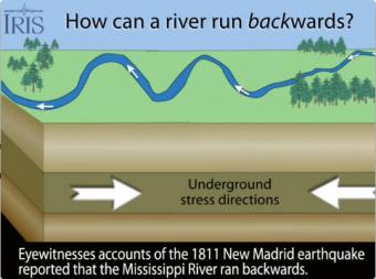 No audio: How can a river run backwards? This animation shows how a river can be forced backwards, albeit only long enough to find a new route. Several written accounts from the New Madrid earthquake of 1811 and 1812 describe the horror as great waters swashed upriver causing lakes to form on previously dry land.