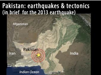 Pakistan is split along the boundary between the Eurasian and Indian plates where the India plate slides northward relative to the Eurasia plate in the east. The Eruasia Plate is also being shoved by the Arabia plate as it subducts northward beneath the Eurasia plate along the boundary south of this map. These motions typically result in north-south to northeast-southwest strike-slip motion.