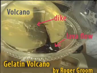 Classroom demonstration using gelatin as a model for teaching magma injection into Earth's crust. The gelatin provides a see-through medium as an analogy for the crust.