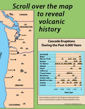 Learn about the volcanoes of the Pacific Northwest Cascade Range mountains by scrolling over individual volcanoes on this interactive map. Gives height, latest eruption, and other notes. Also shows the 4,000-year eruptive history on a US Geological Survey chart of volcanoes.