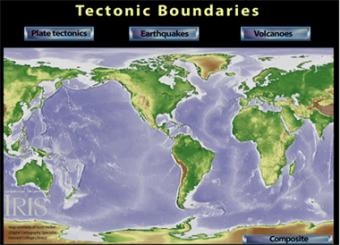 How are the tectonic plates related to earthquakes and volcanoes? This interactive relief and bathymetric map reveals tectonic plates, as well as world-wide earthquakes and volcanoes. By looking at each you can see a positive correlation between all three. Touch "Composite" button to put it all together.