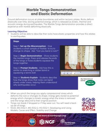 The notion of rocks as elastic solids underpins many seismological concepts including the earthquake cycle and seismic wave propogation. This demonstration physically illustrates this property as students explore several rock/mineral specimens. The demonstration is somewhat discrepant because students' prior experiences suggest that rocks are hard and inflexible. Using this as a starting point, the demonstration begins with attempts to bend a large hand sample of granite or marble. Next, a large mica sample is deformed elastically. Finally, the elastic deformation of a long thin marble slab allows students to see and feel, that solid rocks are indeed elastic. During the discussion students are introduced to the concepts of stress and strain.