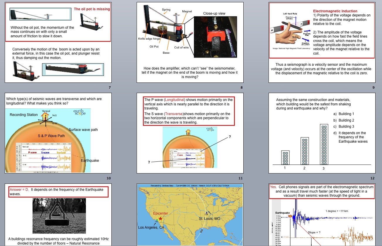 Recognizing the limited time for adding new topics into the physics curriculum, these resources strive to seamlessly integrate geophysics topics and applications into the existing physics curriculum. For example, students can demonstrate their basic knowledge of waves while calculating the magnitude of an earthquake! Newton's Laws have to be endlessly applied to car's or boats, but these same principles are in play when considering tectonic plates or seismographs! Thus, by applying the Conceptual Physics approach used by Paul G. Hewitt these resources seek to make connections between the concepts of physics and the study of Earth.