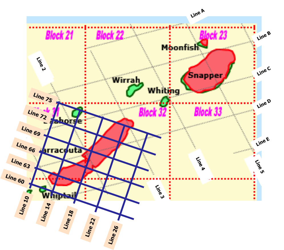 There are two tasks: Complete the interpretation of the Top of Latrobe (TOL) unconformity on the other six (6) lines, and generate a time structure map. For measuring TWT to the TOL, the teams can use the time scale on the left or right side of any of the lines. The teams should measure TWT at the solid and dashed vertical lines marking intersects lines on each seismic line.